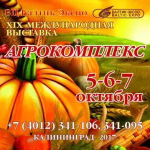 XX Международная специализированная выставка «АГРОКОМПЛЕКС – 2017» Калининград, ВЦ «Балтик-Экспо» 5, 6, 7 октября Все составляющие агропромышленного комплекса «от поля до прилавка» будут представлены в эти дни в Балтик-Экспо. Более 100 фирм из Москвы, Санкт-Петербурга, Белоруссии, Польши, Калининграда примут участие в этой выставке. Выставка «Агрокомплекс» собирает всех представителей агропромышленного комплекса, помогая искать новые рынки сбыта, узнавать о новых направлениях в сельскохозяйственном производстве, решать проблемы отрасли, предопределять возникновение новых, а, следовательно, расти и развиваться.