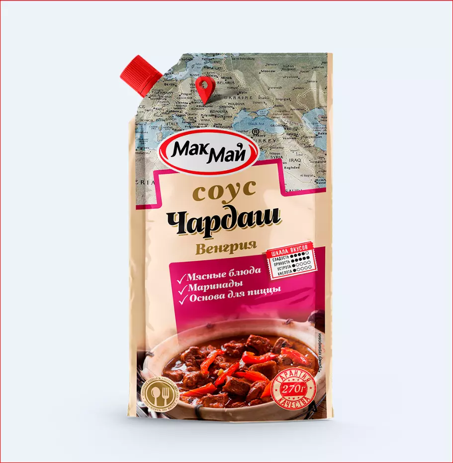 Соус «Чардаш» – это изысканная заправка родом из самой Венгрии. Он имеет характерную кислинку и острый привкус, который дает ему возможность стать прекрасным дополнением к различным блюдам. Душистый и черный перец, тмин, пажитник, базилик и другие специи придадут особый вкус вашим любимым мясным блюдам и овощным гарнирам. А лук, чеснок, сладкий перец подчеркнут изящество и яркость аромата. Массовая доля растворимых сухих веществ – 18%.