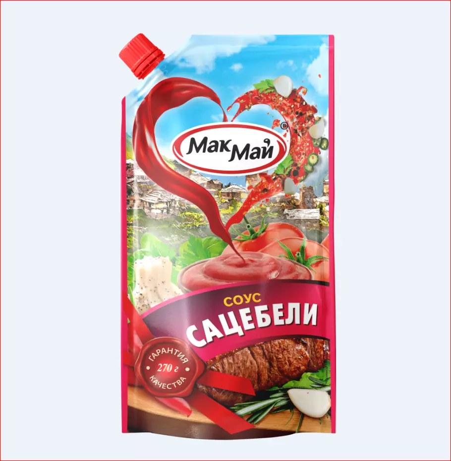 Соус «Сацебели» в состав соуса входит душистая смесь специй «Хмели-сунели», традиционная для восточных блюд, а также другие ароматные приправы – чеснок, перец, кориандр и паприка, служит чудесным вкусовым дополнением к шашлыку, гарнирам из риса, любым блюдам из мяса и маринадам для них. Массовая доля растворимых сухих веществ – 18%.