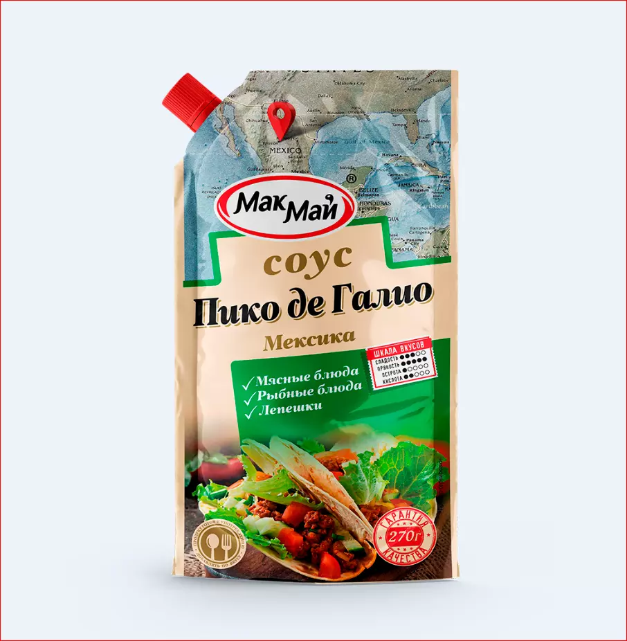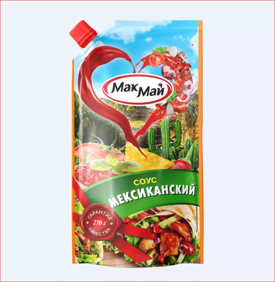 Соус «Мексиканский» изготовлен из красных плотных томатов с добавлением ароматной красной паприки, зубчиков чеснока и колец лука, что придает вкусу соуса одновременно острые, сладкие и жгучие нотки. Соус «Мексиканский» ТМ «МакМай», в котором гармонично сочетаются кусочки овощей, хорошо дополнит мясные и рыбные блюда, а также картофель и макароны. Массовая доля растворимых сухих веществ – 18%.