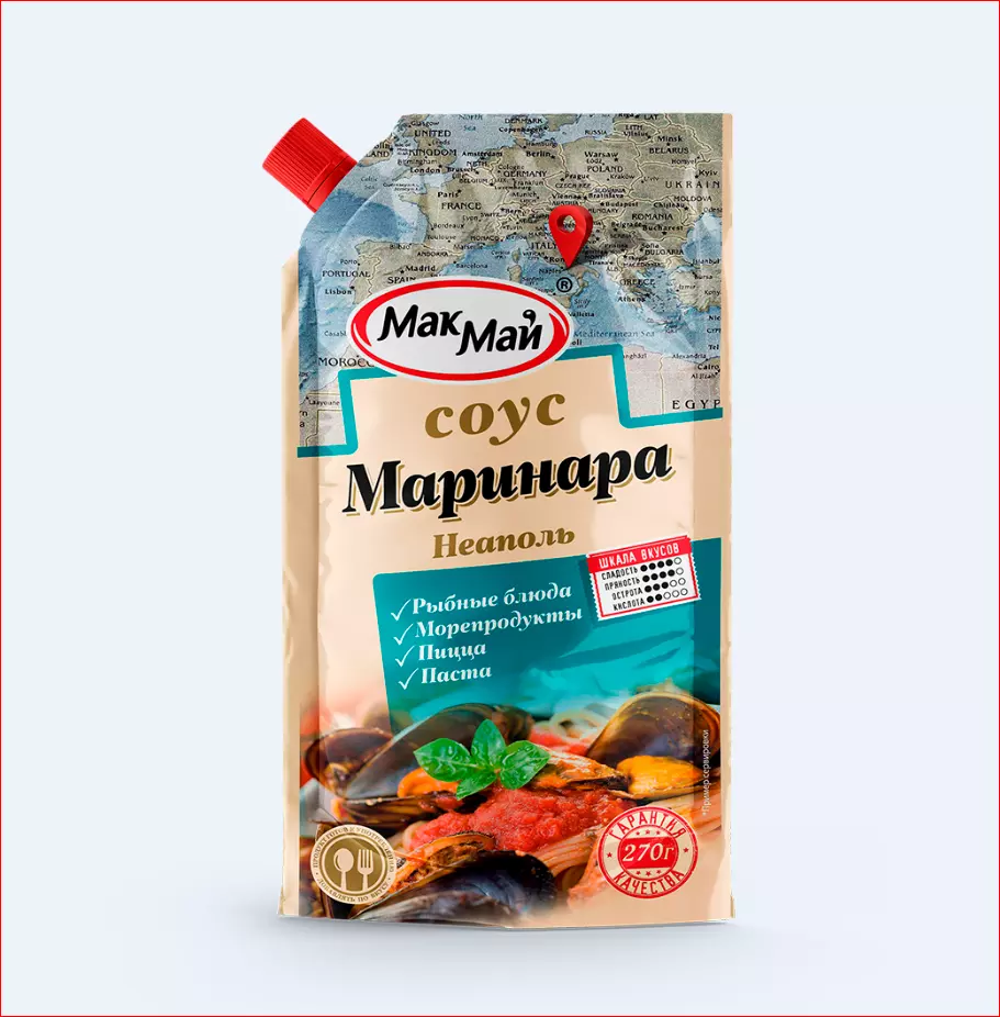 Одна из жемчужин итальянской кулинарной традиции – соус Маринара. Сочетание томатов со средиземноморскими оливками и ароматными специями делают его особенным. Вкус этого соуса настолько понравился потребителям, что этим термином называют не только соус, но и популярную итальянскую пиццу. Его добавляли во многие блюда: пасту, рис, пиццу и морепродукты. Массовая доля растворимых сухих веществ – 18%.