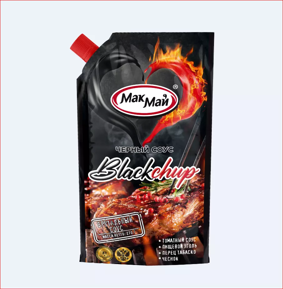 Черный соус «Blackchup» - пожалуй самый необычный и экстремальный соус из всех существующих. Он рассчитан на брутальных гурманов, тех, кто любит огненный вкус. В его состав входят самые острые пряности: чеснок, перец табаско, перец чили. А уникальный черный цвет ему придает настоящий растительный уголь. Прекрасно подойдет к блюдам из мяса, приготовленным на огне. ОСТОРОЖНО- ОСТРО! Массовая доля растворимых сухих веществ – 18%.