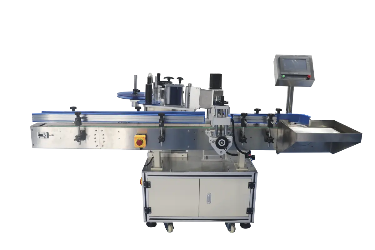 Напольный этикетировщик роликового типа, предназначенный для автоматической горизонтальной маркировки круглых бутылок. Машина поддерживает как одностороннее, так и двухстороннее наклеивание. Роликовый механизм обеспечивает максимально плотный контакт этикетки с поверхностью, исключая дефекты приклейки.